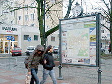 Nową gablotę informacyjno - reklamową ustawiono niedawno na ulicy Bema. Tablica z zegarem swoim wyglądem nawiązuje do stojących w pobliżu stylizowanych latarni. Po jednej stronie umieszczony został plan Słupska oraz ogłoszenia reklamowe, a po drugiej znajdują się informacje Urzędu Miejskiego o planowanych imprezach. (jas)