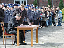 W słupskiej Szkole Policji Minister Spraw Wewnętrznych i Administracji Władysław Stasiak w obecności premiera Jarosława Kaczyńskiego uroczyście podpisał rozporządzenie podnoszące wysokość zarobków policjantów. – Średni wzrost uposażenia policyjnego w przyszłym roku wyniesie około 500 zł. Odnoszę wrażenie, że jest to bez precedensu w historii polskiej policji, ale podkreślam też bardzo mocno, to jest decyzja podjęta nie w celu znajdowania środków nie wiadomo skąd, ale w wyniku oceny sytuacji rozsądnych przesunięć niezwiększających budżetu resortu. To nie są środki dodatkowe – podkreślił minister Spraw Wewnętrznych i Administracji. – To są po prostu środki wygospodarowane w ramach środków budżetowych resortu Spraw Wewnętrznych i Administracji.